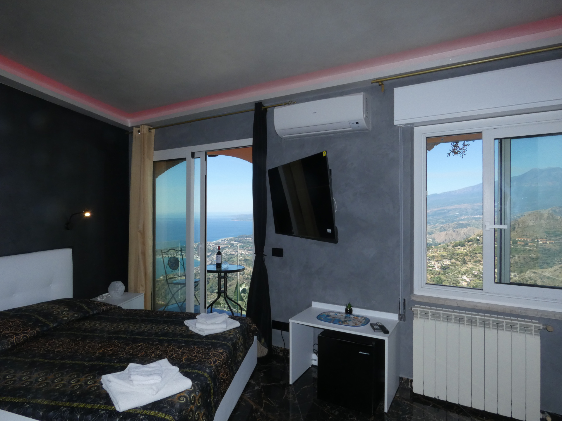 The B&B 'Casa Bellavista', by Alessandro Santamaria, is located in Castelmola (Messina), in Via Tutti Santi 43, above the Belvedere Restaurant, of which it is part. Inaugurated 10 years ago, it is one of the most panoramic B&Bs in the country: from its balconies you can enjoy a wonderful view of Etna, Monte Venere, the Bay of Giardini Naxos and the Cathedral of Castelmola. It is no coincidence that the four rooms of which it is made up are respectively called 'Etna Room', 'Monte Venere Room', 'Baia di Giardini Naxos Room' and 'Duomo Room'. the rooms are all equipped with en-suite bathroom, refrigerator, air conditioning, radiators, and Wi-Fi. Two of them also have two single beds, in addition to the double bed, and are therefore suitable for hosting a family of four. Half board service is available in the Belvedere Restaurant below, part of the structure.